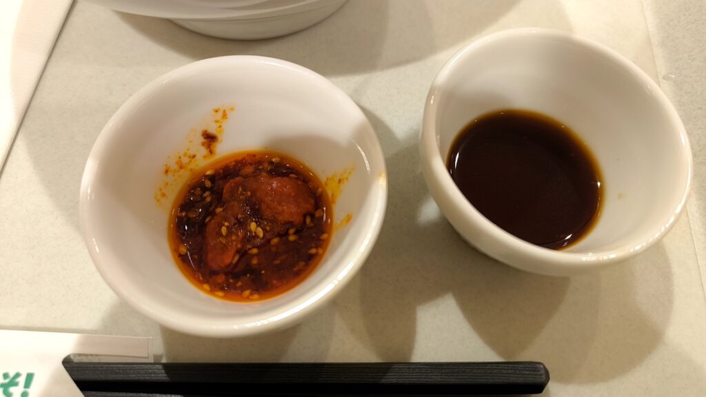 タレが2種類付属しており、一方は辛みを調整できるようです。いずれも、器を鼻に近づけてみましたが、特に香りはせず・・。二つとも全量ぶっかけて、まぜ混ぜしました。