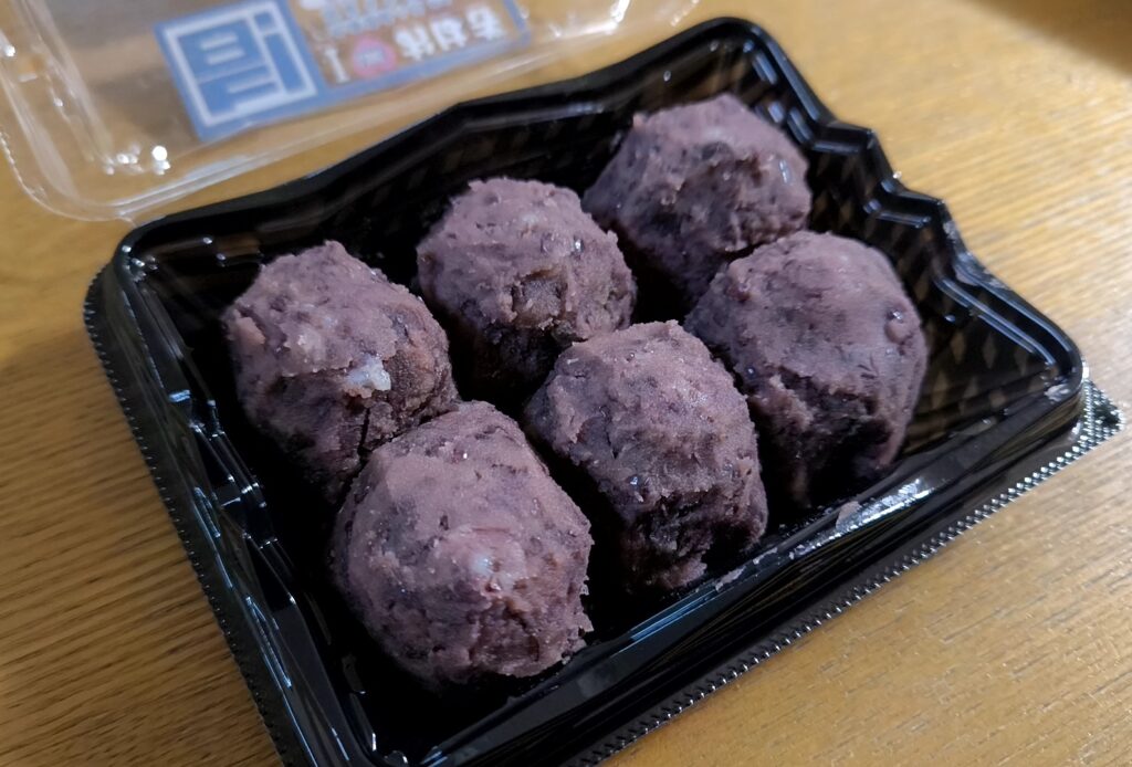 - 価格:税込199円。通常サイズのおはぎが1個100円程度なので、2個分。安い。あんこの他にバリエーションとしてはきな粉があります。最初は通常サイズのあんこ・きな粉が1個ずつ入った品と迷いましたが、あんこが沢山食べたい気分でしたので、こちらを選択しました。