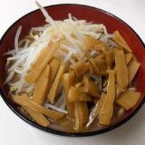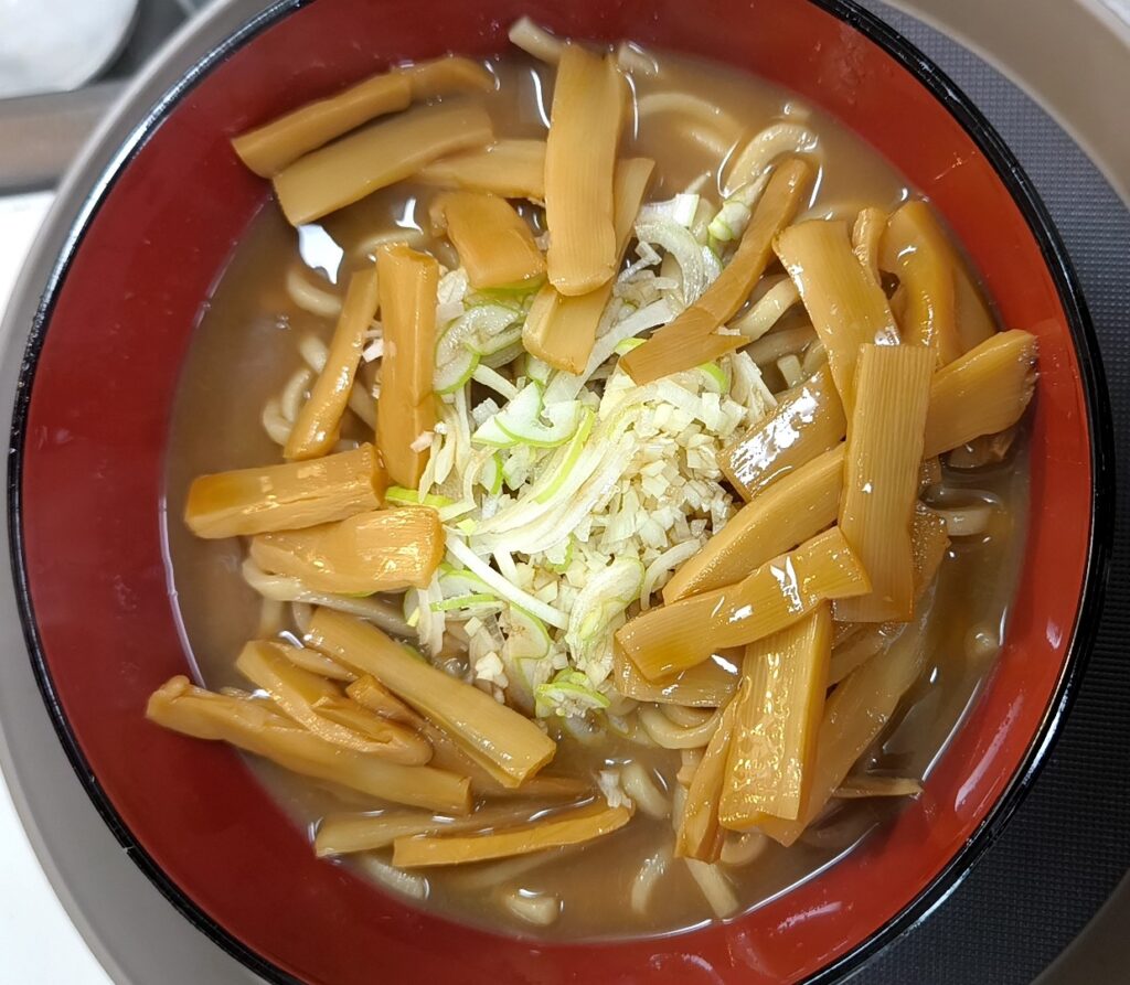 麺の上にはネギとニンニク。ヤサイの下に隠す戦略です。さらにメンマもここで投入。