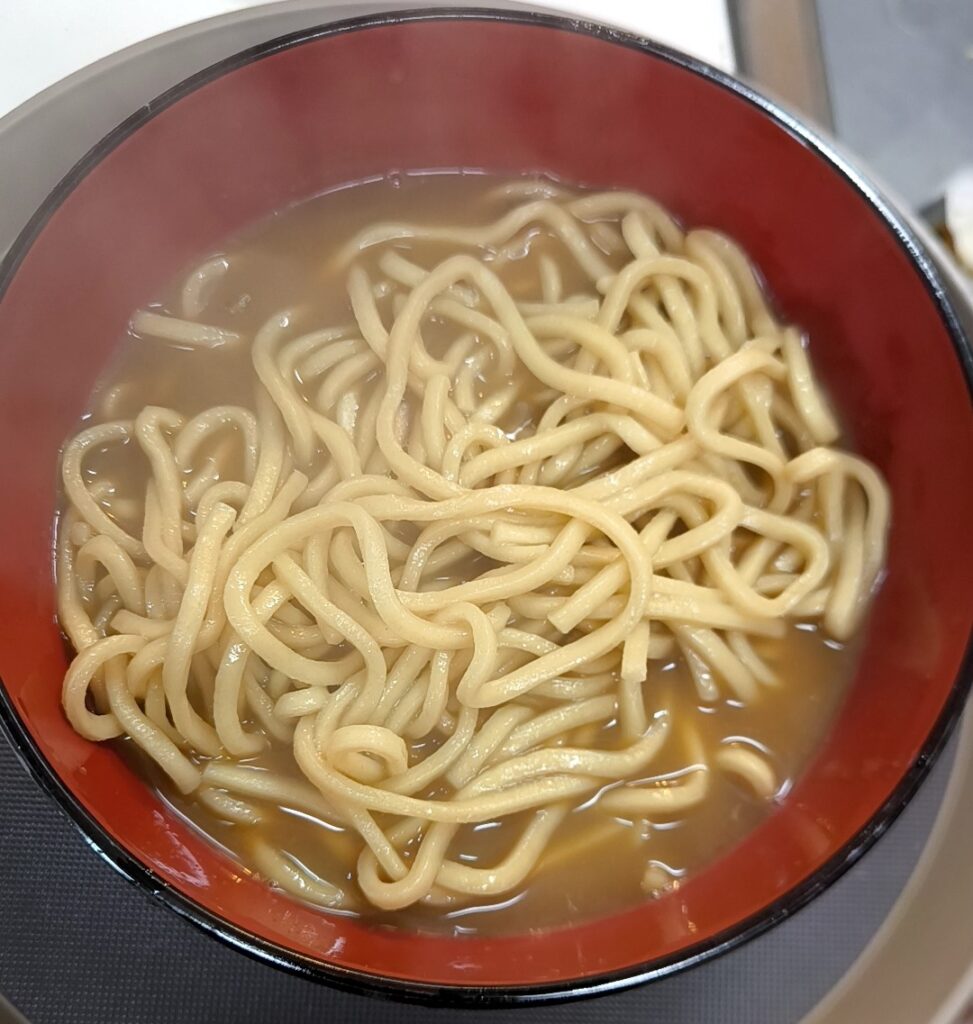 茹でる工程は省略!温めた丼、250ccのお湯で割ったスープに湯切りした麺を投入します。