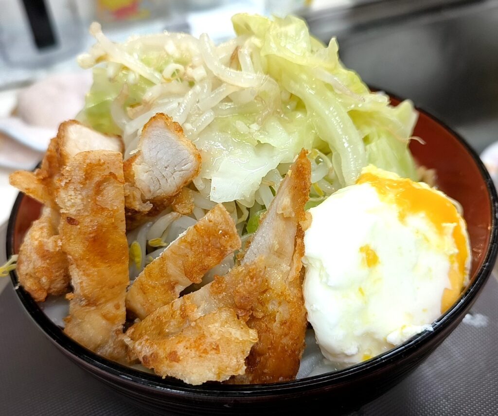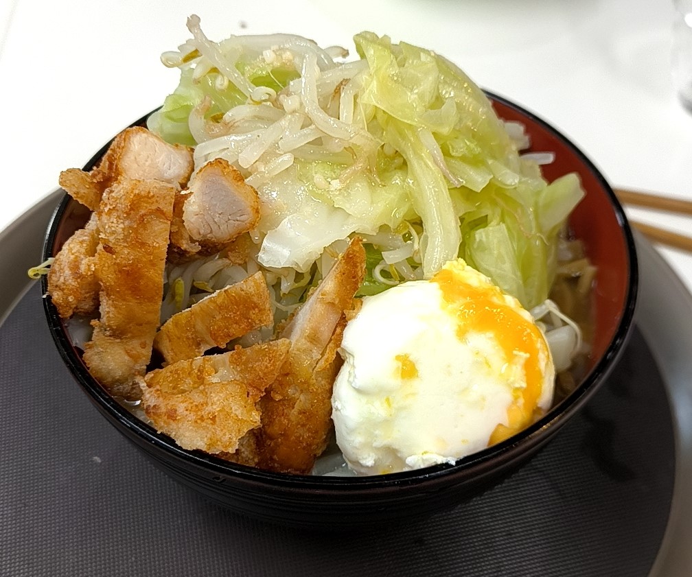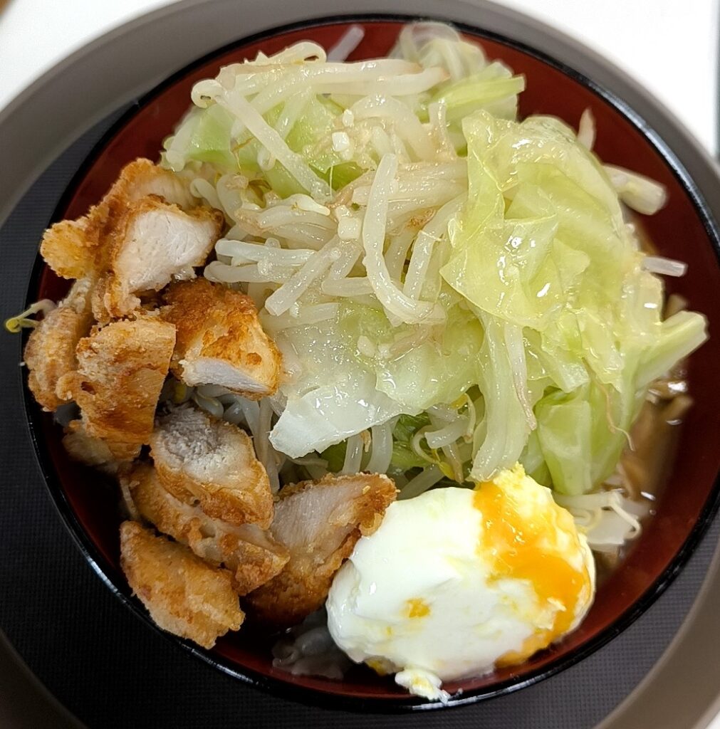 ヤサイ、唐揚げ、温玉改めゆで卵をトッピング、後がけアブラをかけて出来上がりです。