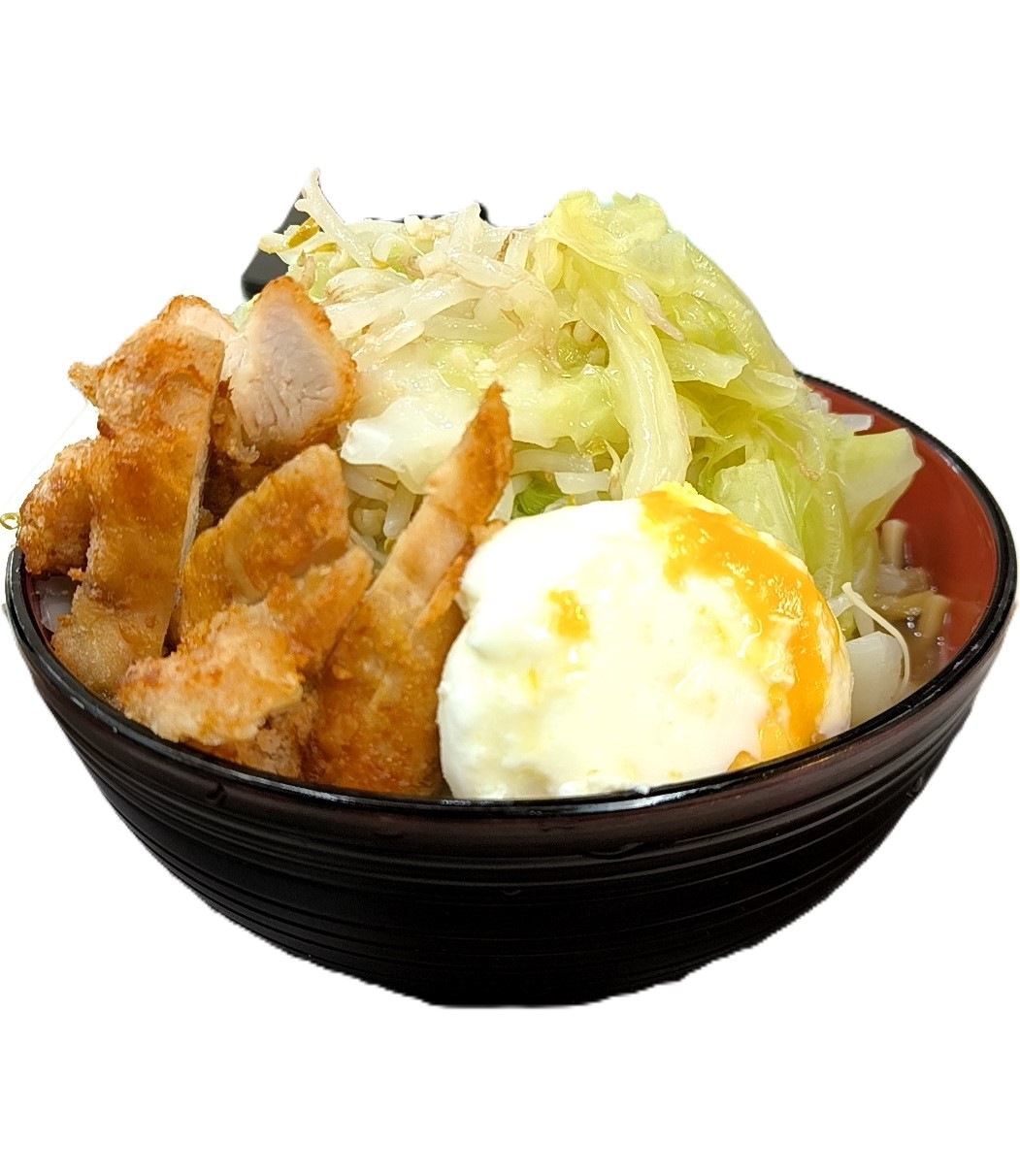 ヤサイ、唐揚げ、温玉改めゆで卵をトッピング、後がけアブラをかけて出来上がりです。