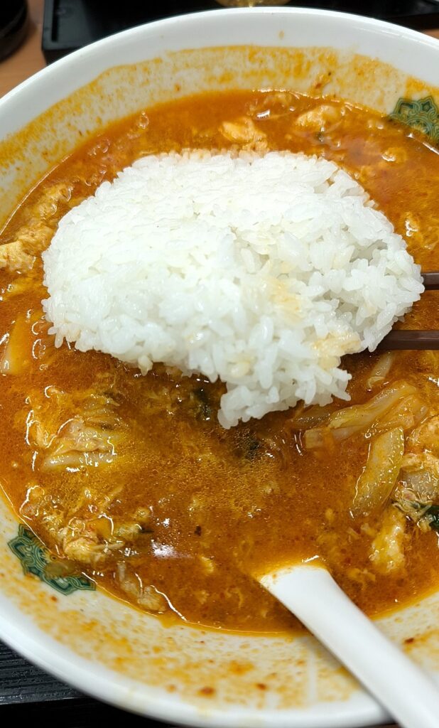 ライスがあるということは、具材と麺をバランスよく食べる必要がありません。私は麺が好きなので、チゲ味噌ラーメンのスープであれば、気の向くままに麺だけ啜ってしまいました。もちろん、具材も併せて食べ進めますが、かなり残っています。そこへ、ライスをドーン!