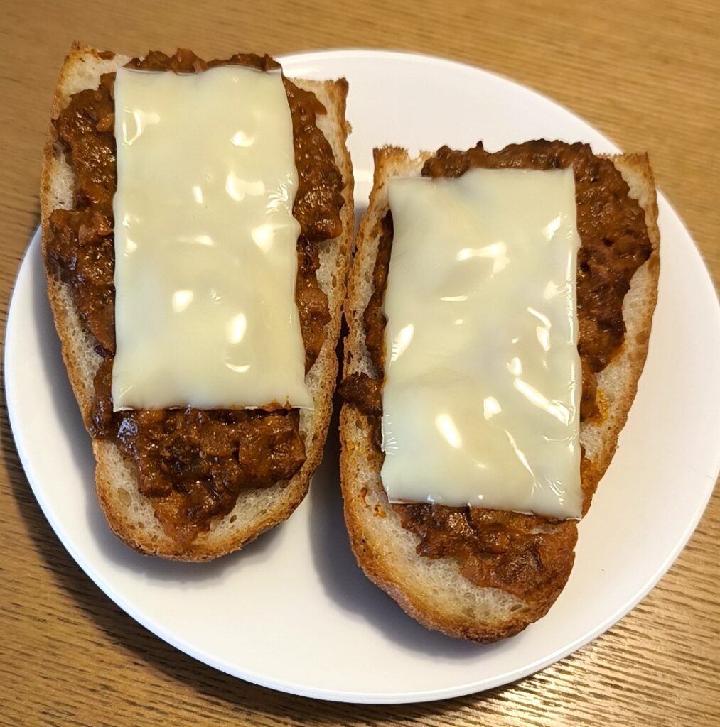 ちょうどバケットがあったので、バケットにチリコンカンとチーズを乗せて、トーストで焼いて食べてみました。続いて、ご飯に載せてさらに目玉焼きと一緒に。
