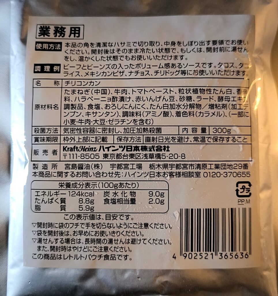 裏側を見ると、ビーフとビーンズの入ったボリューム感あるソースです。タコライス、メキシカンピザ、ナチョス、チリドッグ等に・・。とあるので、味の想像はできた。