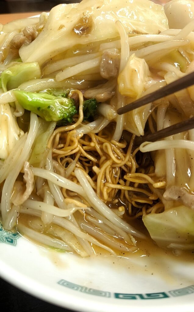 麺はリンガーハットの長崎皿うどんのような細麺を揚げてあるタイプでした。これは、あんが染みて柔らかくなった部分と、パリパリの部分の両方の食感が楽しめるのが好み。